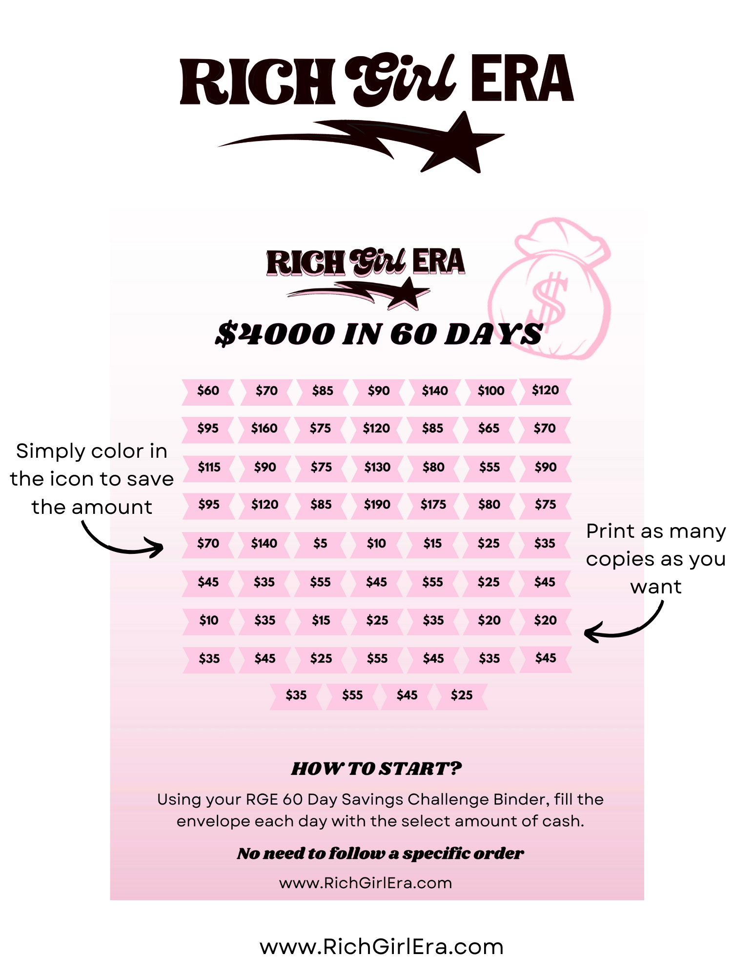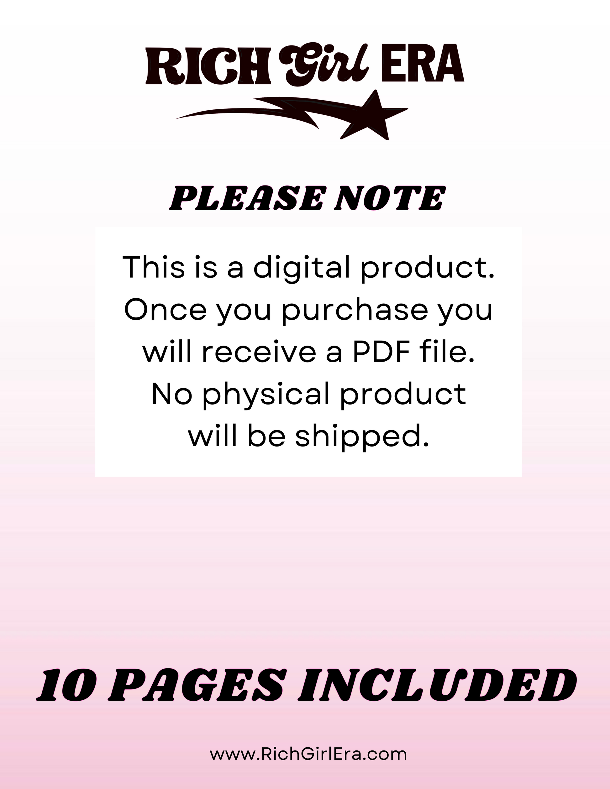 Are you ready to tackle your savings goals? Our Savings Challenge bundle is here to help! This collection includes a variety of mini savings challenge printables designed to make tracking your progress easier and more fun! Each challenge features a minimalist design and is perfectly sized to fit your Rich Girl Era budget binder. The concept is simple: fill in the icon for each savings challenge as you save the corresponding amount of money. It's an awesome way to stay motivated and achieve your savings goals. Goodluck!!